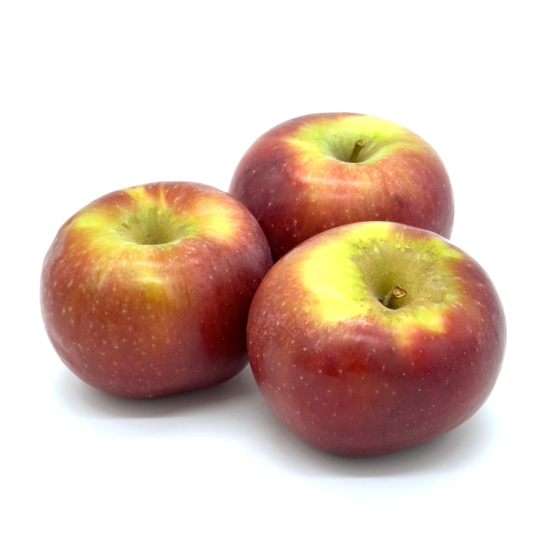 Cortland apples are medium to large in size, and often rather flat in shape. They are bright red, covered with dark red streaks, and often capped with a green blush. Their crisp, finely-grained white flesh is exceptionally juicy with a sharp, sweet-tart, vinous flavor.